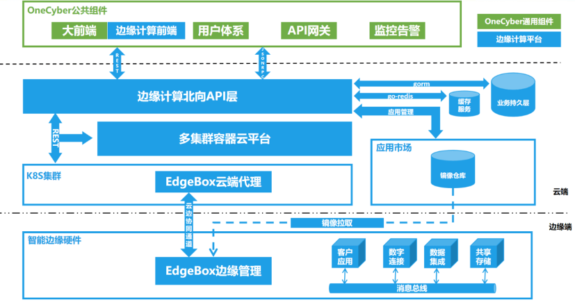 - 多集群容器云平台:向北向 API 层提供节点,容器,和多集群的管理能力,南向管理 EdgeBox 的云端代理和承载云端代理的K8S集群。