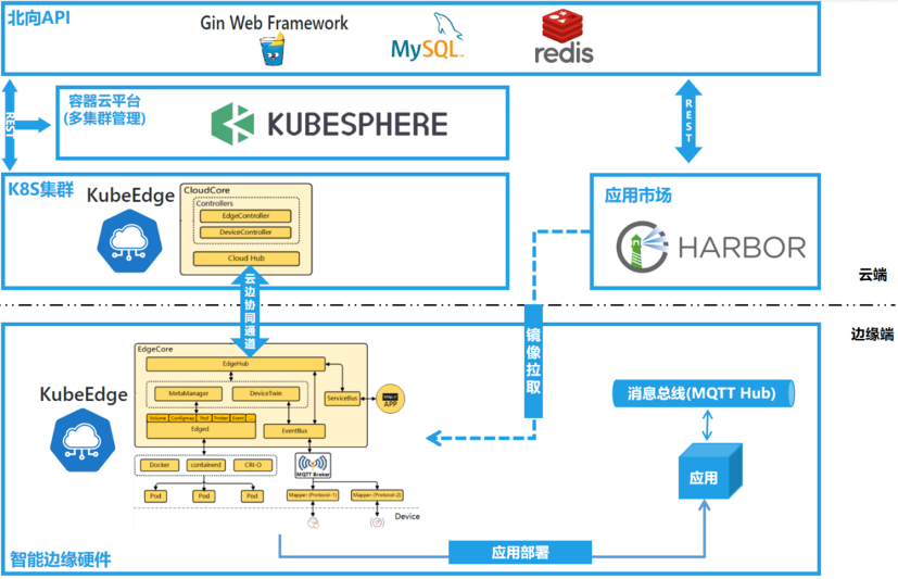 - 云边消息:包括云边用户消息和数据通道,云边 REST 和 MQTT 双向通道,云边 REST 和 REST 双向通道。