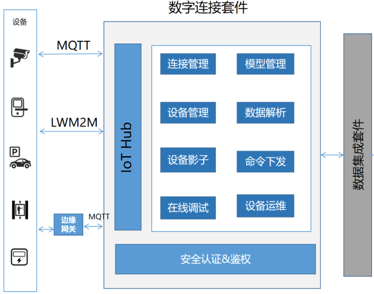 数字连接套件提供物联网设备接入、多协议解析、协议转换、命令下发等一站式连接能力。支持电信级可靠、海量接入、跨机房部署。