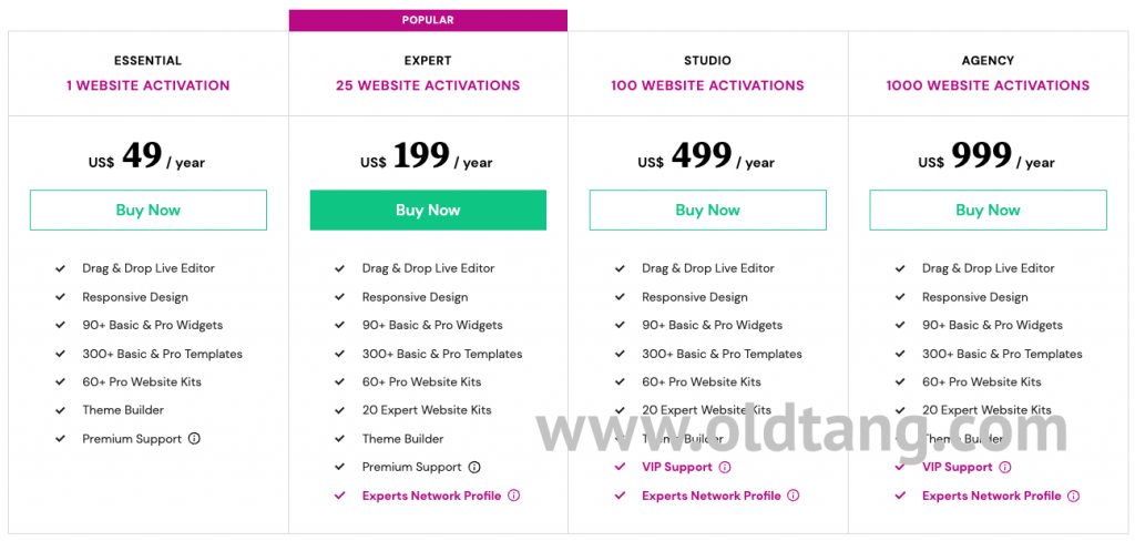 可以看到 Elementor 不同套餐对应不同价格,最贵的可以达到 $999 一年,支持 1000 个网站授权。