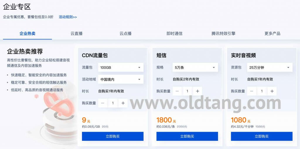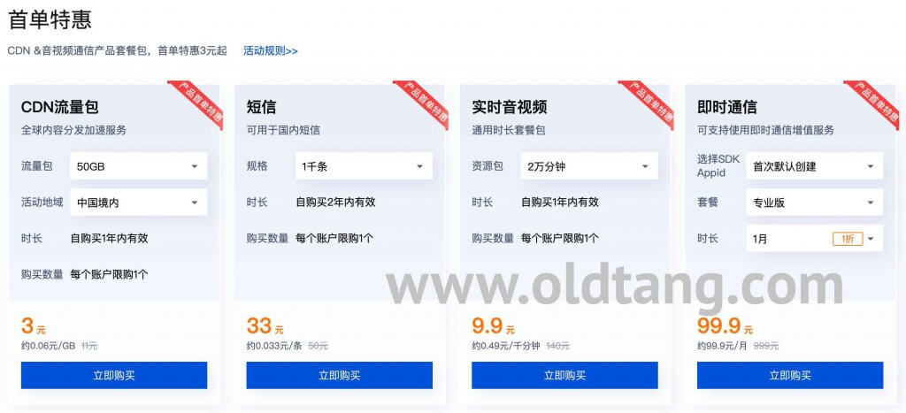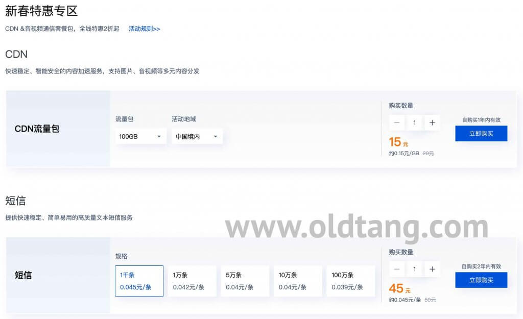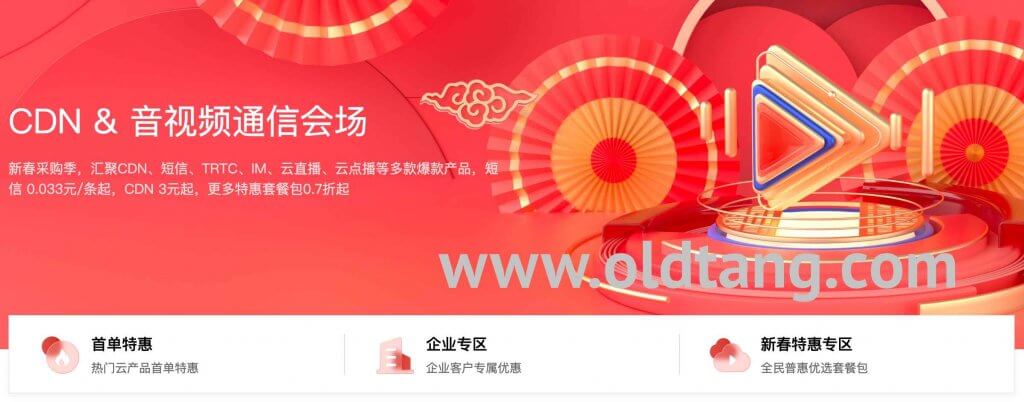 腾讯云 CDN & 音视频通信会场,新春采购季,汇聚 CDN、短信、TRTC、IM、云直播、云点播等多款爆款产品,短信 0.033元/条起,CDN 3元起,更多特惠套餐包 0.7 折起。活动主要分为三大块,分别是首单特惠、企业专区、新春特惠专区等。价格都是非常便宜的,目前 CDN、短信等这些业务基本都是处在抢占市场阶段,可能本身用户就不多,所以价格就很优惠。