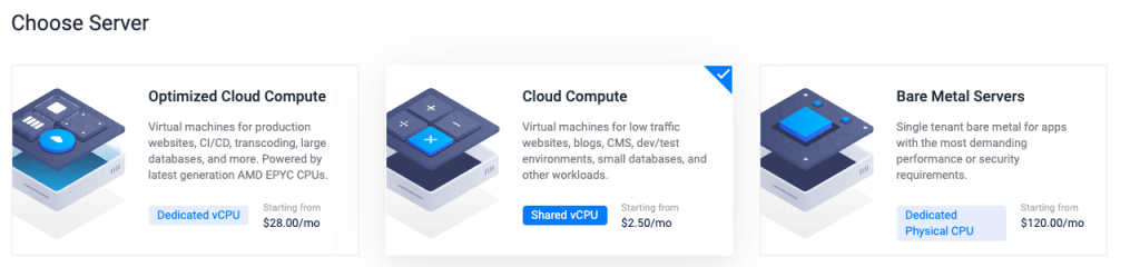 - 裸机——这些服务器每月 120 美元起,提供专用物理 CPU 和对服务器底层硬件的直接访问,从而在没有任何虚拟化开销的情况下提供最高性能。Bare Metal 与我们的 VM 一样易于配置和管理,对于特别密集的工作负载,它可以提供最佳的性价比。
