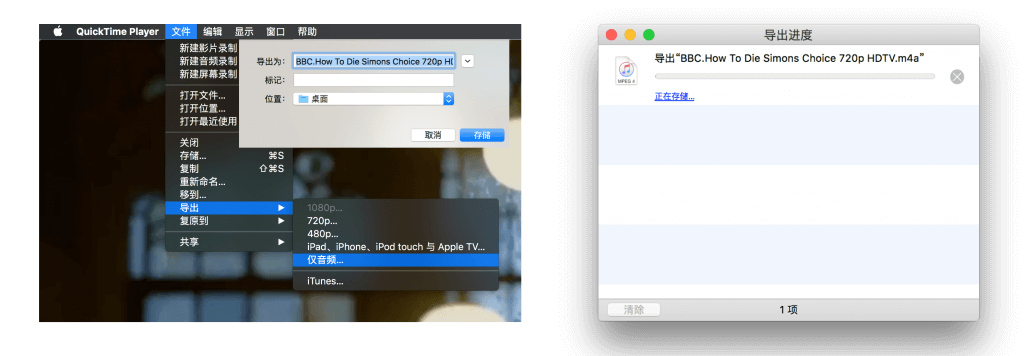 使用 QuickTime Player 打开目标视频文件,依次点击菜单栏中的「文件 – 导出 – 仅音频」,设置导出文件名称、存放位置,然后点击「存储」,即可将其导出为包含 AAC 音轨的 Apple MPEG 4 音频文件。