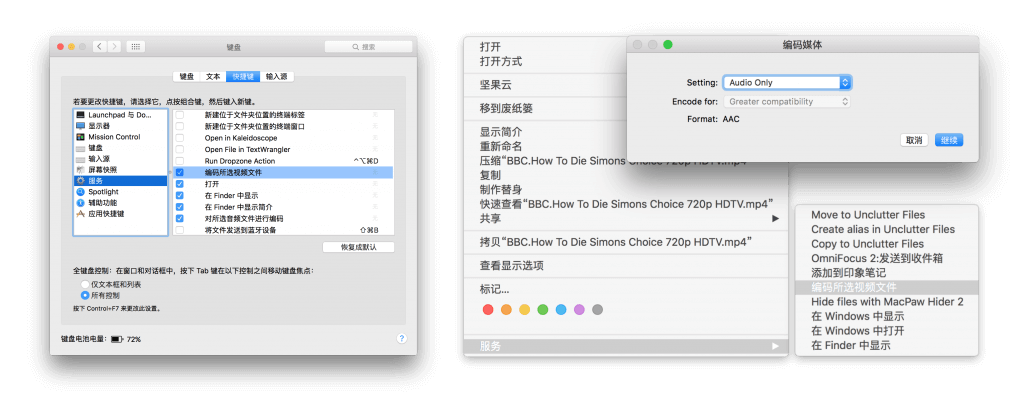 除此之外,如果你在「系统偏好设置 – 键盘 – 快捷键 – 服务」中勾选了「编码所选视频文件」的话,还可以通过右键进行操作:选中目标文件,右键选择「服务-编码所选视频文件」。在弹出的「编码媒体」窗口中,设置「Setting」(设定)为「Audio Only」(仅音频),单击「继续」即可。随后,在 Menu Bar 栏中,将出现一个转动的小齿轮图标,点击即可查看导出进度。