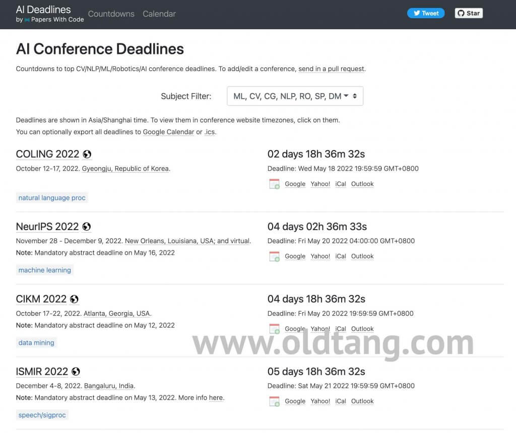 这几天给一个学生改论文,说起投哪个会议,我还想着查一查整理一下 AI 会议的截稿日期,结果对方直接发来一个链接。学到了学到了,AI Conference Deadlines,已经整理了很多会议的截稿日期,方便大家查询。不知道有没有朋友搞个类似的网络会议截稿日期。