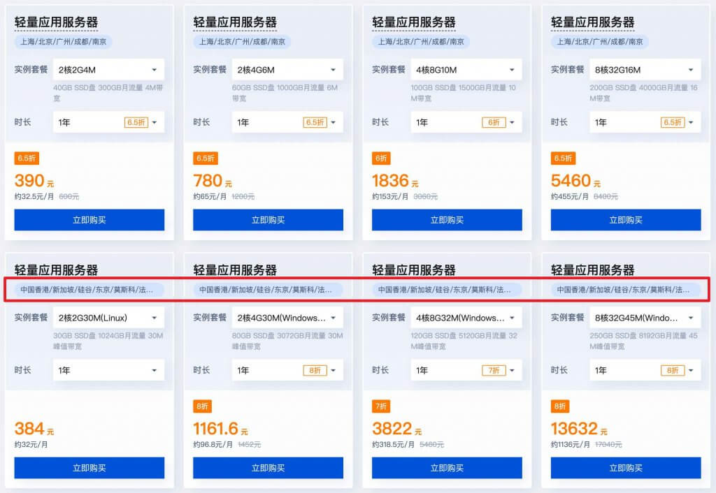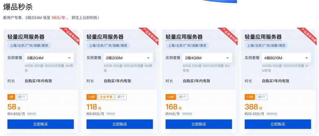 首先是爆品秒杀,有一些大陆地区的轻量应用服务器秒杀,包括上海、北京、广州、成都、南京等地区。