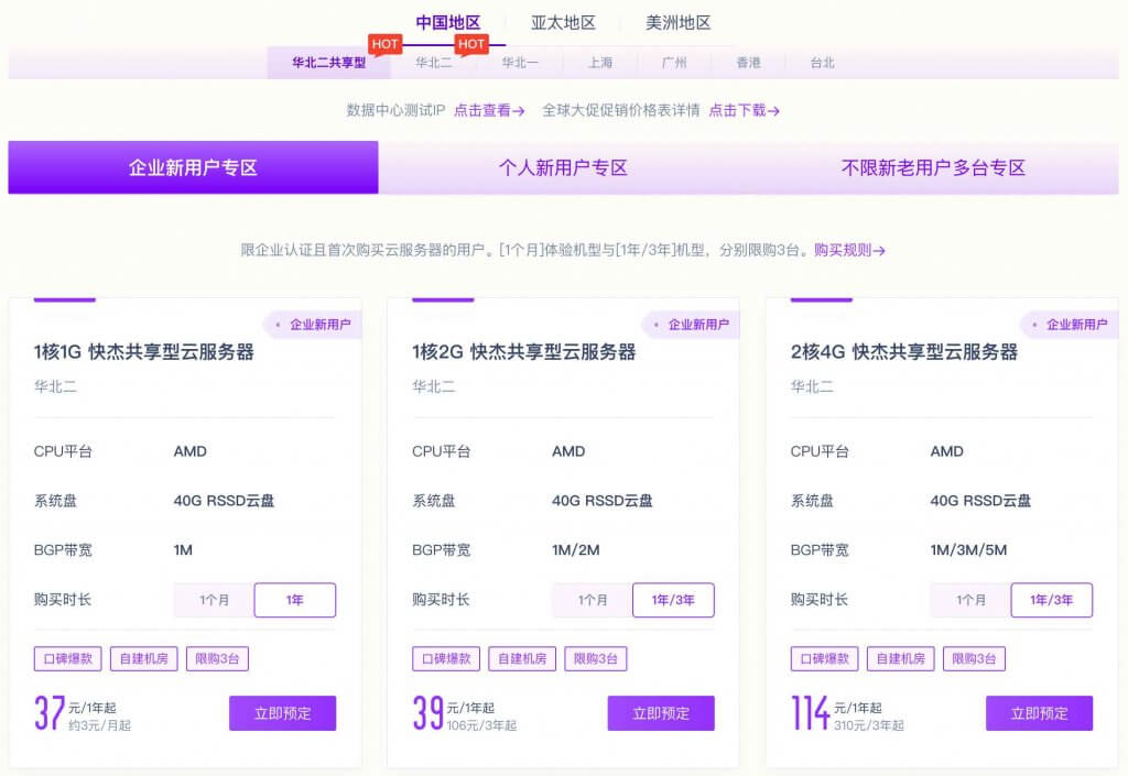 可以看到华北二共享型的价格是非常便宜的,共享 CPU,不是独享的。1核2G 的价格是 39 元/年,2核4G 的价格是 114 元/年,都是非常便宜的。