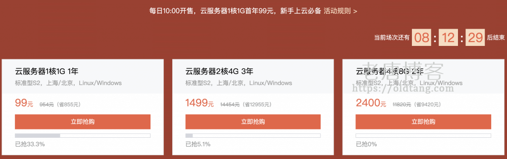 新用户秒杀方案如下,,可以看到最便宜的只需要 99 元/年,中间的 1499 元/3年的方案老唐个人认为是非常超值的,主要是带宽也比较大。