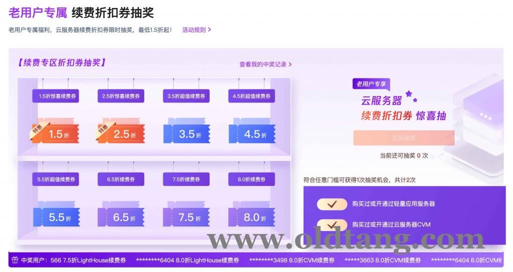 腾讯云老用户活动又来了,这次是老用户抽奖活动,只要是购买或开通过轻量应用服务器或者是云服务器 CVM,那么就可以进行抽奖。每个老用户最多可以抽奖两次,续费券的力度从 1.5 折到 8.0 折,运气好的可以抽到 1.5 折,运气差一些可能就是 8 折,大家不妨前往抽奖看看自己运气如何。