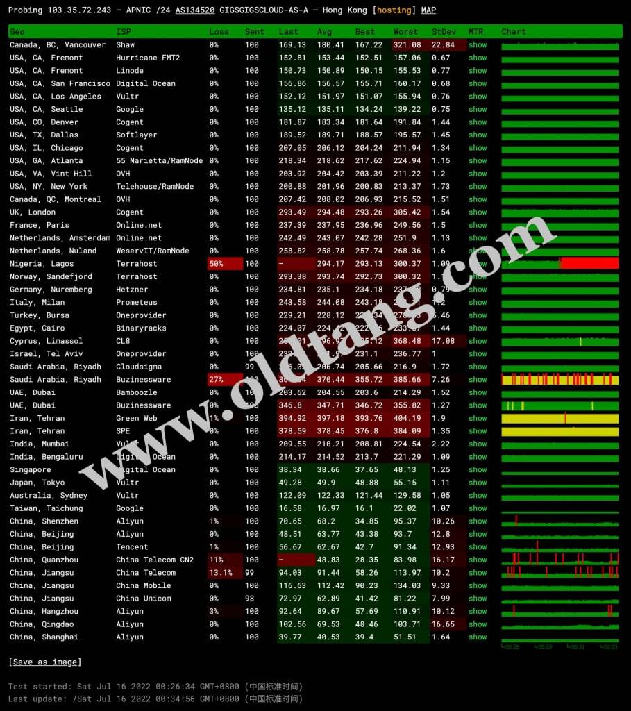 ---------------------------------------------------------------------- 北京电信 traceroute to 219.141.147.210 (219.141.147.210), 30 hops max, 32 byte packets 1 103.35.72.1 0.84 ms AS134520 中国, 香港, techavenue.net 2 * 3 unicom1-100g.hkix.net (123.255.91.154) 51.10 ms * 中国, 香港, hkix.net 4 * 5 219.158.10.29 49.20 ms AS4837 中国, 广东, 广州, chinaunicom.com, 联通 6 219.158.103.29 29.42 ms AS4837 中国, 广东, 广州, chinaunicom.com, 联通 7 * 8 219.158.19.225 101.84 ms AS4837 中国, 北京, chinaunicom.com, 联通 9 219.158.4.154 102.93 ms AS4837 中国, 北京, chinaunicom.com, 联通 10 * 11 * 12 * 13 2.254.120.106.static.bjtelecom.net (106.120.254.2) 106.58 ms AS4847 中国, 北京, chinatelecom.com.cn, 电信 14 bj141-147-210.bjtelecom.net (219.141.147.210) 102.77 ms AS4847 中国, 北京, chinatelecom.com.cn, 电信 ---------------------------------------------------------------------- 上海电信 traceroute to 202.96.209.133 (202.96.209.133), 30 hops max, 32 byte packets 1 103.35.72.1 0.37 ms AS134520 中国, 香港, techavenue.net 2 * 3 unicom1-100g.hkix.net (123.255.91.154) 55.10 ms * 中国, 香港, hkix.net 4 * 5 219.158.10.29 31.22 ms AS4837 中国, 广东, 广州, chinaunicom.com, 联通 6 219.158.24.137 33.51 ms AS4837 中国, 广东, 广州, chinaunicom.com, 联通 7 * 8 219.158.109.9 62.66 ms AS4837 中国, 上海, chinaunicom.com, 联通 9 219.158.8.226 59.06 ms AS4837 中国, 上海, chinaunicom.com, 联通 10 202.97.17.193 79.65 ms AS4134 中国, 上海, chinatelecom.com.cn, 电信 11 * 12 101.95.88.113 64.17 ms AS4812 中国, 上海, chinatelecom.com.cn, 电信 13 180.169.255.114 151.84 ms AS4812 中国, 上海, chinatelecom.com.cn, 电信 14 ns-pd.online.sh.cn (202.96.209.133) 68.80 ms AS4812 中国, 上海, chinatelecom.com.cn, 电信 ---------------------------------------------------------------------- 深圳电信 traceroute to 58.60.188.222 (58.60.188.222), 30 hops max, 32 byte packets 1 103.35.72.1 0.34 ms AS134520 中国, 香港, techavenue.net 2 * 3 unicom1-100g.hkix.net (123.255.91.154) 52.55 ms * 中国, 香港, hkix.net 4 43.252.86.141 41.59 ms AS10099 中国, 香港, chinaunicom.com, 联通 5 219.158.10.29 36.89 ms AS4837 中国, 广东, 广州, chinaunicom.com, 联通 6 219.158.103.29 57.23 ms AS4837 中国, 广东, 广州, chinaunicom.com, 联通 7 * 8 219.158.9.34 71.76 ms AS4837 中国, 广东, 广州, chinaunicom.com, 联通 9 * 10 * 11 183.56.65.10 55.17 ms AS4134 中国, 广东, 深圳, chinatelecom.com.cn, 电信 12 * 13 58.60.188.222 69.22 ms AS4134 中国, 广东, 深圳, chinatelecom.com.cn, 电信 ---------------------------------------------------------------------- 北京联通 traceroute to 202.106.50.1 (202.106.50.1), 30 hops max, 32 byte packets 1 103.35.72.1 0.34 ms AS134520 中国, 香港, techavenue.net 2 * 3 061093184210.static.ctinets.com (61.93.184.210) 4.15 ms AS10103 中国, 香港, hkbn.net 4 202.4.163.3 4.70 ms * 中国, 香港, hkbn.net 5 014136142018.ctinets.com (14.136.142.18) 4.88 ms AS9269 中国, 香港, hkbn.net 6 * 7 219.158.32.25 48.31 ms AS4837 中国, 香港, chinaunicom.com, 联通 8 219.158.10.53 49.72 ms AS4837 中国, 广东, 广州, chinaunicom.com, 联通 9 219.158.111.121 74.06 ms AS4837 中国, 北京, chinaunicom.com, 联通 10 219.158.16.77 52.88 ms AS4837 中国, 北京, chinaunicom.com, 联通 11 219.158.5.145 42.09 ms AS4837 中国, 北京, chinaunicom.com, 联通 12 125.33.186.194 68.23 ms AS4808 中国, 北京, chinaunicom.com, 联通 13 202.106.50.1 74.84 ms AS4808 中国, 北京, chinaunicom.com, 联通 ---------------------------------------------------------------------- 上海联通 traceroute to 210.22.97.1 (210.22.97.1), 30 hops max, 32 byte packets 1 103.35.72.1 0.62 ms AS134520 中国, 香港, techavenue.net 2 * 3 unicom1-100g.hkix.net (123.255.91.154) 55.74 ms * 中国, 香港, hkix.net 4 43.252.86.65 69.63 ms AS10099 中国, 香港, chinaunicom.com, 联通 5 43.252.86.129 58.94 ms AS10099 中国, 香港, chinaunicom.com, 联通 6 219.158.20.97 50.52 ms AS4837 中国, 香港, chinaunicom.com, 联通 7 219.158.115.125 31.98 ms AS4837 中国, 上海, chinaunicom.com, 联通 8 219.158.19.86 34.17 ms AS4837 中国, 上海, chinaunicom.com, 联通 9 219.158.19.81 33.95 ms AS4837 中国, 上海, chinaunicom.com, 联通 10 * 11 139.226.201.146 43.10 ms AS17621 中国, 上海, chinaunicom.com, 联通 12 210.22.97.1 35.63 ms AS17621 中国, 上海, chinaunicom.com, 联通 ---------------------------------------------------------------------- 深圳联通 traceroute to 210.21.196.6 (210.21.196.6), 30 hops max, 32 byte packets 1 103.35.72.1 0.37 ms AS134520 中国, 香港, techavenue.net 2 * 3 unicom1-100g.hkix.net (123.255.91.154) 52.62 ms * 中国, 香港, hkix.net 4 43.252.86.65 74.25 ms AS10099 中国, 香港, chinaunicom.com, 联通 5 202.77.23.25 34.54 ms AS10099 中国, 香港, chinaunicom.com, 联通 6 219.158.10.49 24.00 ms AS4837 中国, 广东, 广州, chinaunicom.com, 联通 7 219.158.24.133 32.99 ms AS4837 中国, 广东, 广州, chinaunicom.com, 联通 8 * 9 * 10 120.80.144.34 57.27 ms AS17623 中国, 广东, 深圳, chinaunicom.com, 联通 11 dns2-ftcg.gdsz.cncnet.net (210.21.196.6) 58.46 ms AS17623 中国, 广东, 深圳, chinaunicom.com, 联通 ---------------------------------------------------------------------- 北京移动 traceroute to 221.179.155.161 (221.179.155.161), 30 hops max, 32 byte packets 1 103.35.72.1 0.33 ms AS134520 中国, 香港, techavenue.net 2 * 3 63.216.143.81 9.43 ms AS3491,AS31713 中国, 香港, pccw.com 4 hundredge0-5-0-1.br02.tok02.pccwbtn.net (63.218.250.233) 53.99 ms AS3491,AS31713 日本, 东京都, 东京, pccw.com 5 63-217-103-26.static.pccwglobal.net (63.217.103.26) 99.13 ms AS3491,AS31713 日本, 东京都, 东京, pccw.com 6 223.120.2.245 112.75 ms AS58453 日本, 东京都, 东京, chinamobile.com, 移动 7 223.120.2.198 286.44 ms AS58453 中国, 北京, chinamobile.com, 移动 8 221.183.55.110 283.97 ms AS9808 中国, 北