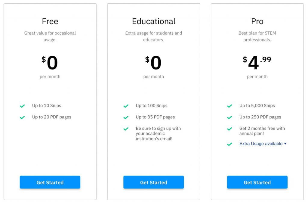 在 Mathpix 的价格页面(https://mathpix.com/pricing)可以看到教育版的价格,每月 0 元,可以识别 100 个公式。