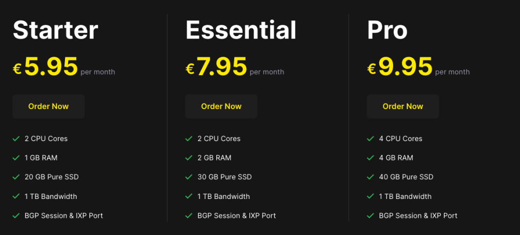 | CN2 | 1GB | 1核 | 20GB | 1TB | 1Gbps | DC3 CN2 DC8 ZNET DC2 QNET DC4 MCOM 美国弗里蒙特 美国新泽西 美国纽约 荷兰阿姆斯特丹 | $49.99/年 | 购买 |