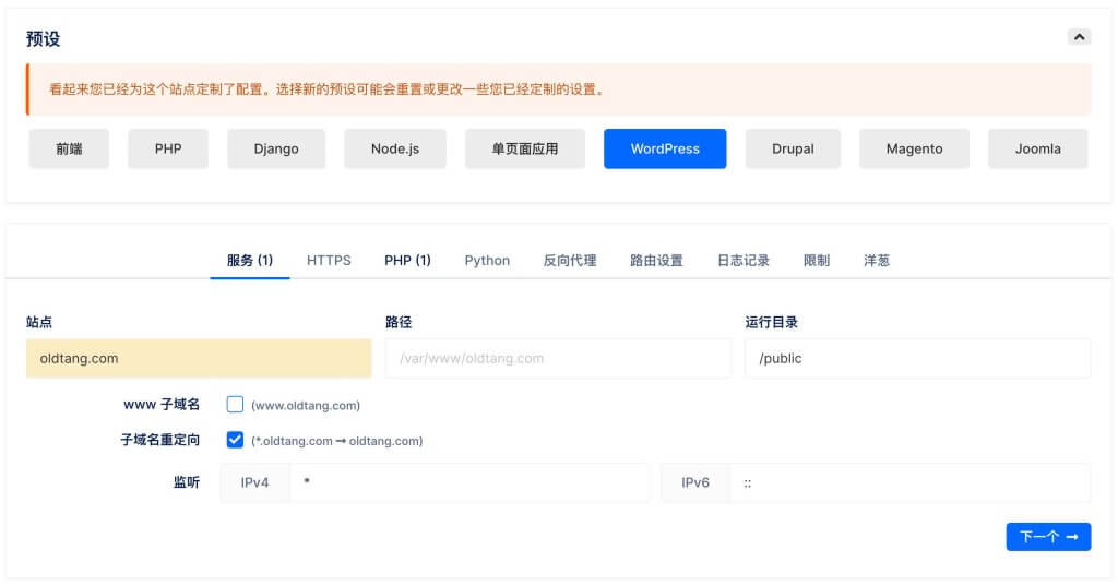 进入上述地址之后,首先可以选择是否要预设配置,比如选择一个 WordPress 预设配置,然后输入域名等信息,点击下一步,依次配置 HTTPS、PHP、Python 等各种配置项。