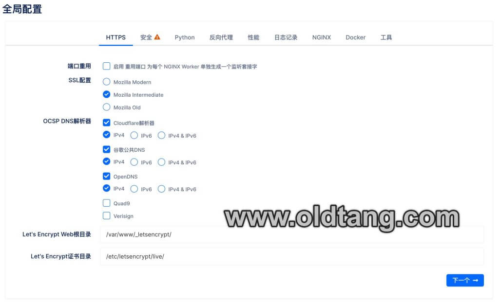 然后进行全局配置,包括 SSL 配置、安全、性能等,可以根据自己需求进行配置。