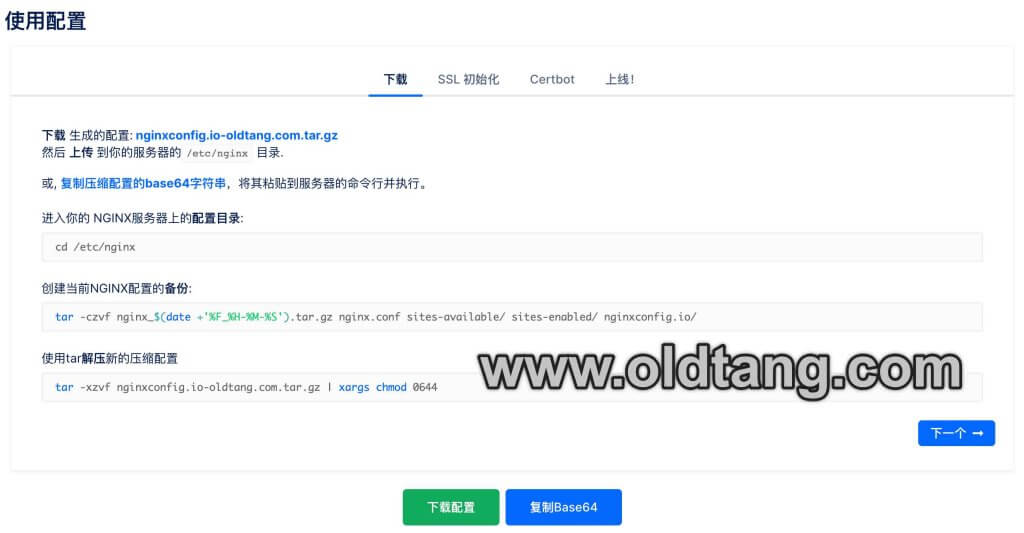 之后就是使用配置文件,可以下载配置文件,然后上传到对应的目录,或者是直接复制压缩配置的 base64 字符串,粘贴到服务器的命令行执行即可,具体方法的话页面都有说明。