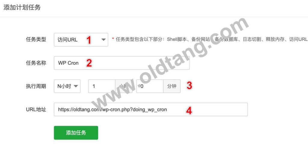 任务类型选择“访问URL”,执行周期设为30分钟,URL网址设置为: