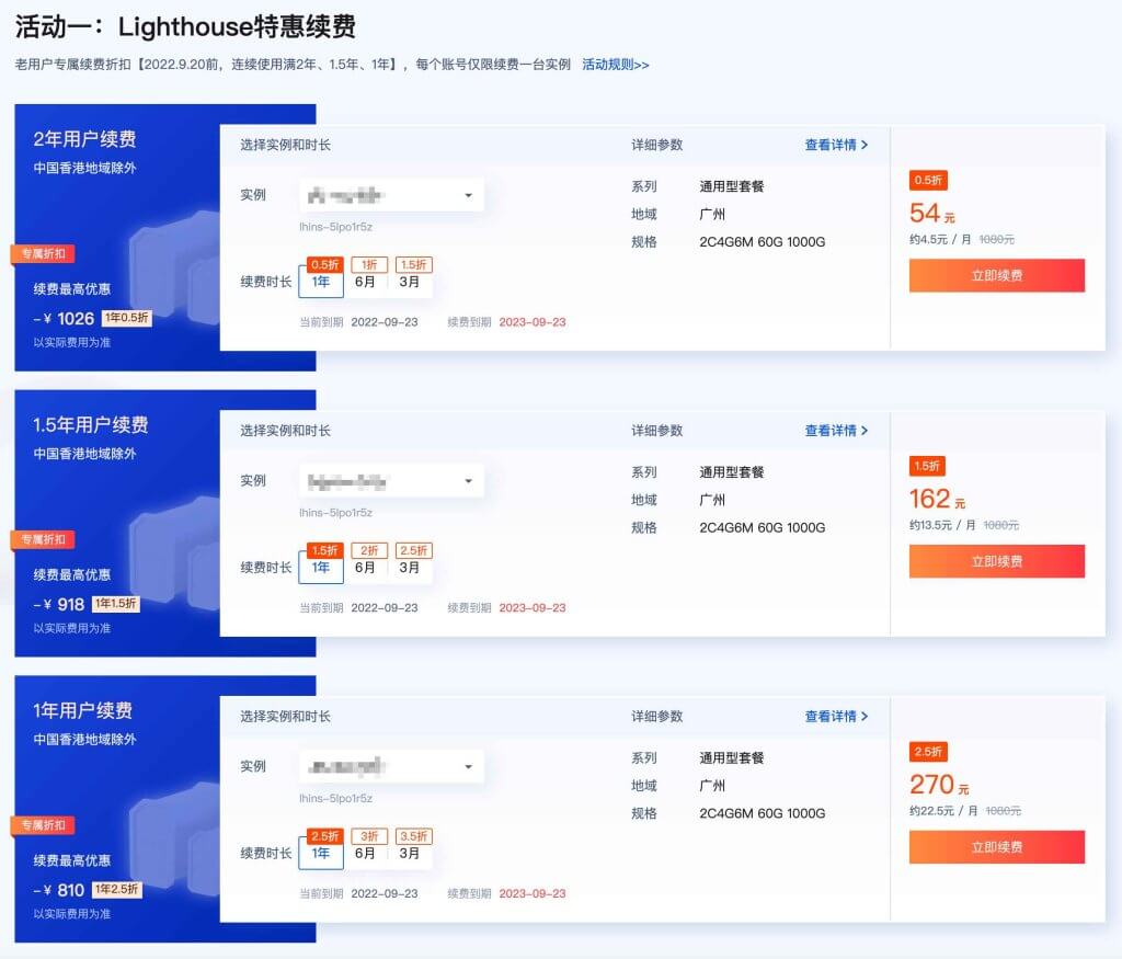 如图所示,特惠续费价格很低,续费一年的话 0.5 折,老唐的这台服务器只要 54 块钱,一个月 4.5 元。大家自行前往上面的活动地址查看续费详情即可。