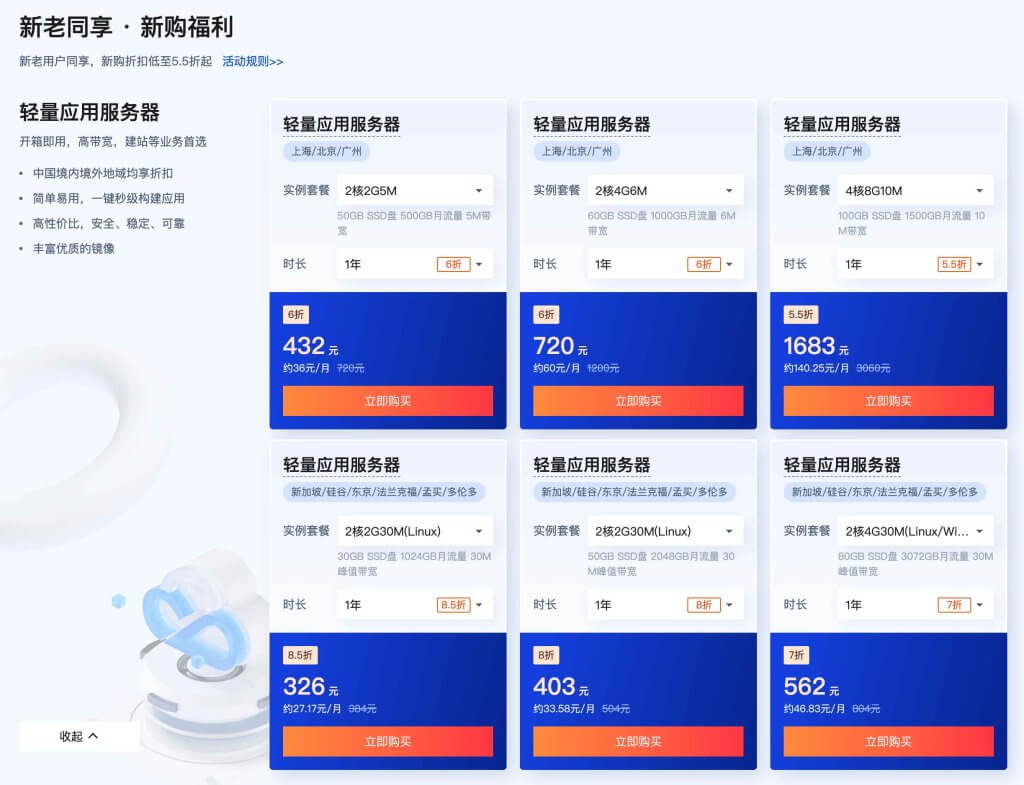 腾讯云轻量应用服务器两周年庆活动还有一个新购活动,之前介绍过续费活动《腾讯云轻量应用服务器两周年庆活动,老用户专享0.5折续费》,这次新购活动折扣是 5.5 折,力度也是蛮大的。如果之前没买过腾讯云轻量应用服务器,现在可以购买,然后两年后等到四周年庆活动的时候就可以享受 0.5 折续费了。