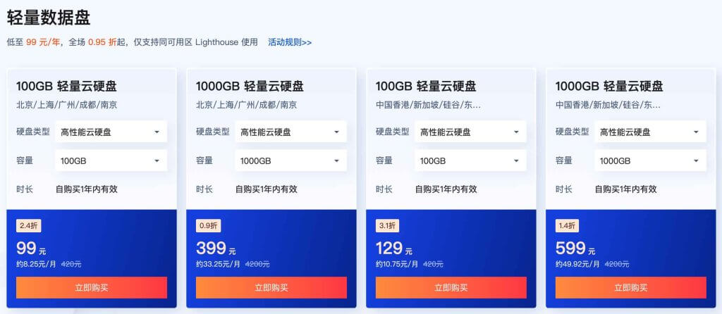 其次是轻量数据盘优惠,低至 99 元/年,全场 0.95 折起,仅支持同可用区 Lighthouse 使用。