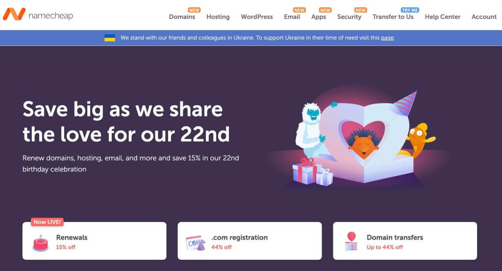 NameCheap 开启了一波周年庆活动,庆祝他们的第 22 年生日。时光荏苒,NameCheap 居然已经第 22 年了,而老唐建站至今也有 11 年了,从 2012 年开始搭建第一个懵懂的网站,到现在已经 2022 年了。NameCheap 总体而言是一家靠谱的域名注册商,不说别的,只说域名价格和靠谱程度的话,以及还有客服响应程度,各方面都是值得推荐的。