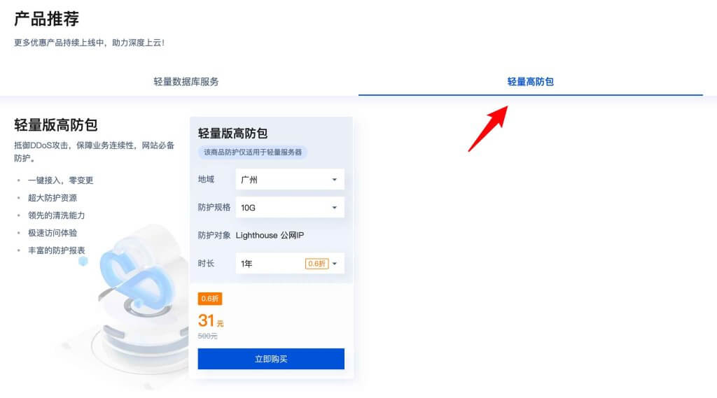 搜了一下发现购买地址隐藏的挺深,在下面的页面拉到最下面,看到产品推荐里面可以找到这个轻量高防包购买地址。
