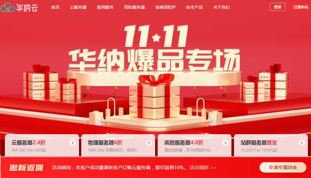 华纳爆品专场双11活动如期而至,本次活动内容共分为以下五个板块,分别是:云机首购限时秒杀,独立服务器6折特惠专区、高防服务器4折专区、云服务器优惠专区、ddos防护服务以及老客邀新等板块。其中重磅福利-高防服务器叠加送防御,美国云服务器叠加送带宽买多少送多少,加量不加价!!!