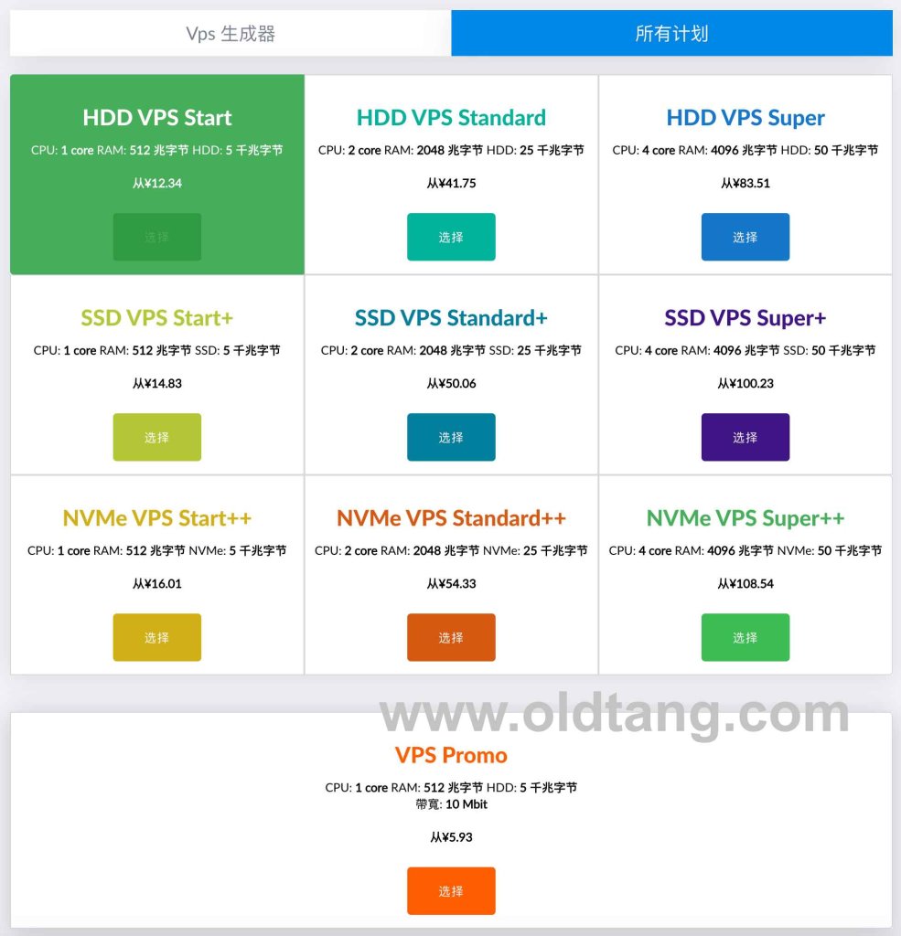 进入官网之后,点击 VPS 菜单就可以看到所有 VPS 计划,选择自己想要的配置即可,包括 HDD、SSD、NVMe 等多种配置可选。