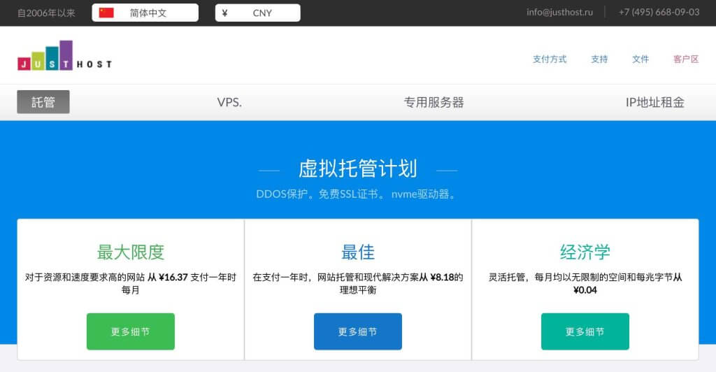Justhost 是一家成立于 2006 年的 VPS 商家,来自俄罗斯,不过提供多个地区的机房。目前来看 Justhost 最大的优势就是便宜便宜非常便宜,最便宜的 VPS 套餐每个月只需要几块钱就可以买到,配置还都过得去。这么便宜的 VPS 对应的线路目前老唐还没有亲自测试,大家有需求也可以尝试。