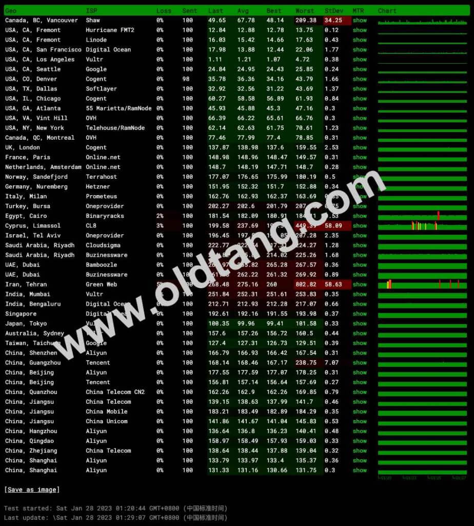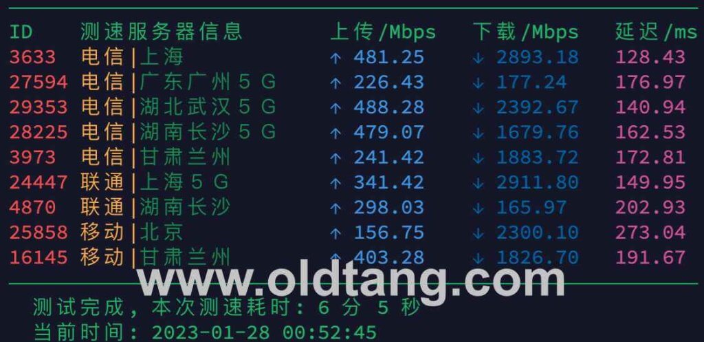 2023/01/27 17:23:50 正在测试三网回程路由... 2023/01/27 17:23:51 北京电信 219.141.136.12 电信CN2 [优质线路] 2023/01/27 17:23:51 北京联通 202.106.50.1 电信CN2 [优质线路] 2023/01/27 17:23:51 北京移动 221.179.155.161 电信CN2 [优质线路] 2023/01/27 17:23:51 上海电信 202.96.209.133 电信CN2 [优质线路] 2023/01/27 17:23:51 上海联通 210.22.97.1 电信CN2 [优质线路] 2023/01/27 17:23:51 上海移动 211.136.112.200 电信CN2 [优质线路] 2023/01/27 17:23:51 广州电信 58.60.188.222 电信CN2 [优质线路] 2023/01/27 17:23:51 广州联通 210.21.196.6 电信CN2 [优质线路] 2023/01/27 17:23:51 广州移动 120.196.165.24 电信CN2 [优质线路] 2023/01/27 17:23:51 成都电信 61.139.2.69 电信CN2 [优质线路] 2023/01/27 17:23:51 成都联通 119.6.6.6 电信CN2 [优质线路] 2023/01/27 17:23:51 成都移动 211.137.96.205 电信CN2 [优质线路]