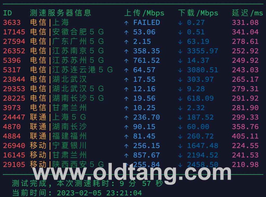 2023/02/05 11:09:37 正在测试三网回程路由... 2023/02/05 11:09:38 北京电信 219.141.136.12 电信163 [普通线路] 2023/02/05 11:09:38 北京联通 202.106.50.1 联通4837[普通线路] 2023/02/05 11:09:38 北京移动 221.179.155.161 移动CMI [普通线路] 2023/02/05 11:09:38 上海电信 202.96.209.133 电信163 [普通线路] 2023/02/05 11:09:38 上海联通 210.22.97.1 联通4837[普通线路] 2023/02/05 11:09:38 上海移动 211.136.112.200 移动CMI [普通线路] 2023/02/05 11:09:38 广州电信 58.60.188.222 电信163 [普通线路] 2023/02/05 11:09:38 广州联通 210.21.196.6 联通4837[普通线路] 2023/02/05 11:09:38 广州移动 120.196.165.24 移动CMI [普通线路] 2023/02/05 11:09:38 成都电信 61.139.2.69 电信163 [普通线路] 2023/02/05 11:09:38 成都联通 119.6.6.6 联通4837[普通线路] 2023/02/05 11:09:38 成都移动 211.137.96.205 移动CMI [普通线路]