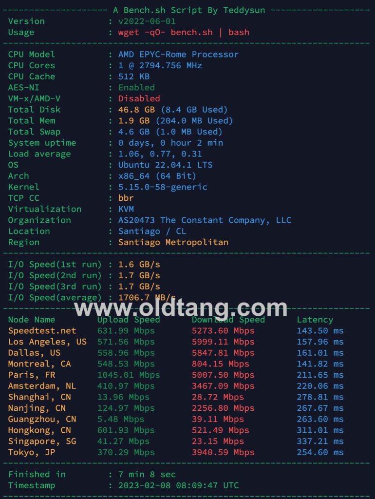 Vultr 最近新增两个机房,其中一个就是智利圣地亚哥机房,参考《Vultr 新增全球第 29 个云数据中心机房:智利圣地亚哥机房》,今天老唐开通了一台 Vultr VPS,一起来测评一下这个全新的 Vultr 机房效果怎么样,速度快不快,延迟低不低,丢包率高不高。
