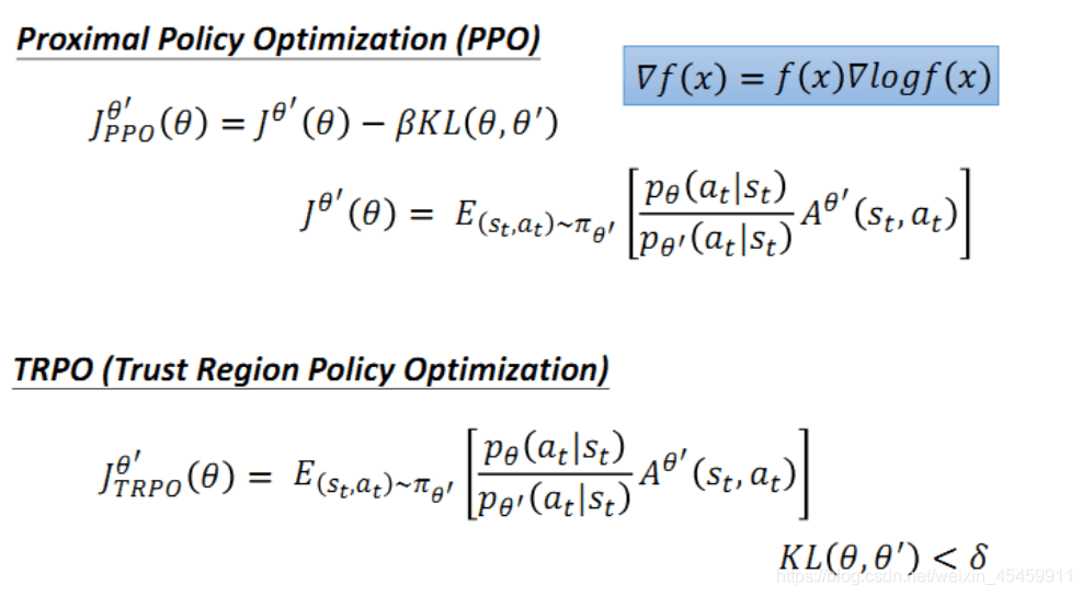 TRPO 与 PPO 之间的差别在于它使用了 KL divergence(KL散度)作为约束,即没有放到式子里,而是当做了一个额外的约束式子,这就使得TRPO的计算非常困难,因此较少使用。两者的区别如下: