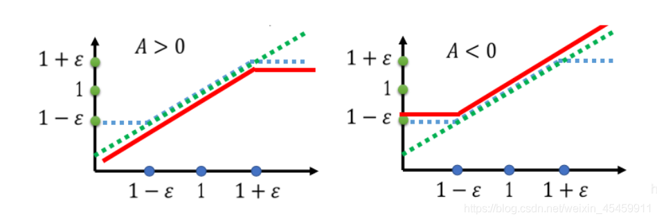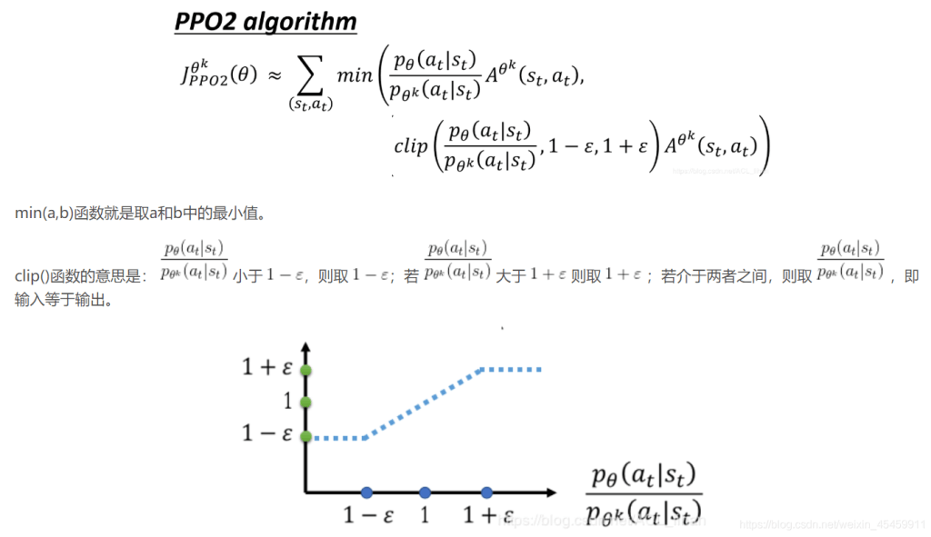PPO2 通过引入了 Clip 函数,使第二项,即蓝色的虚线必须在 1 – ϵ 和 1 + ϵ 之间。
