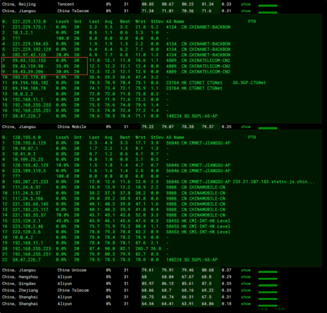 毕竟是新加坡机房,而且是 CN2 GIA 优化线路,所以我们还是关注亚洲节点的,整体速度和丢包率还是比较好的。