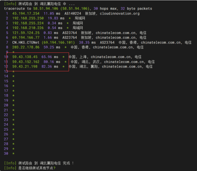 既然上面测试过去程电信节点,这里测试看看回程电信节点,依旧是 59.43 的 CN2 线路。