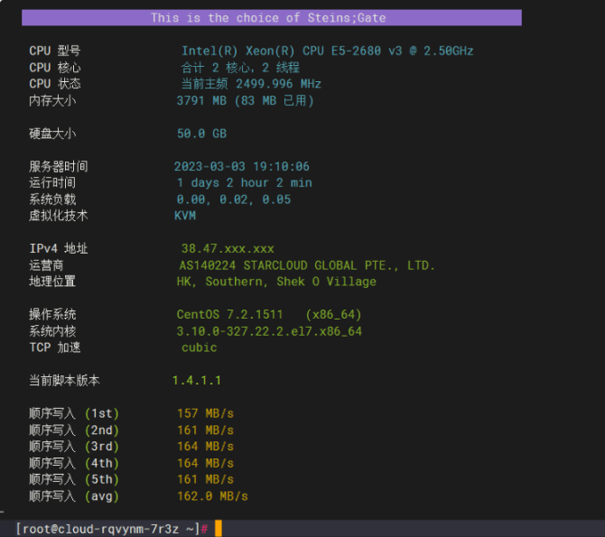 可以看到这款新加坡云服务器使用的是英特尔 E5-2680 V3 的处理器,主频是 2.5GHz,磁盘 IIO 在 162MB/秒,这个性能还是相当不错的。