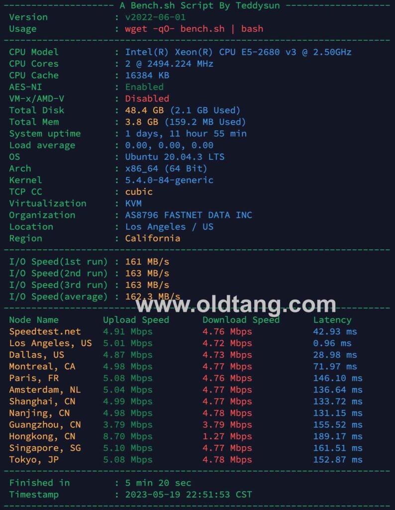 首先是 Jtti 美国洛杉矶 CN2 GIA 的总体测评,由于带宽是 5Mbps,所以 TCP 拥塞控制使用 cubic 或者 bbr 也没什么区别。硬盘读写速度还是挺快的,达到了 SSD 水平。