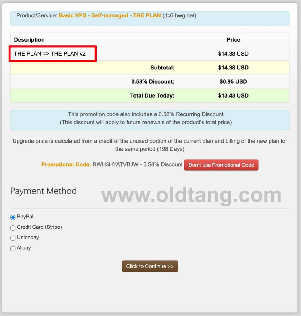 除此之外,还可以更换优惠力度更大的优惠码,参考《搬瓦工升级套餐时可以使用优惠码或者更换力度更大的优惠码》。