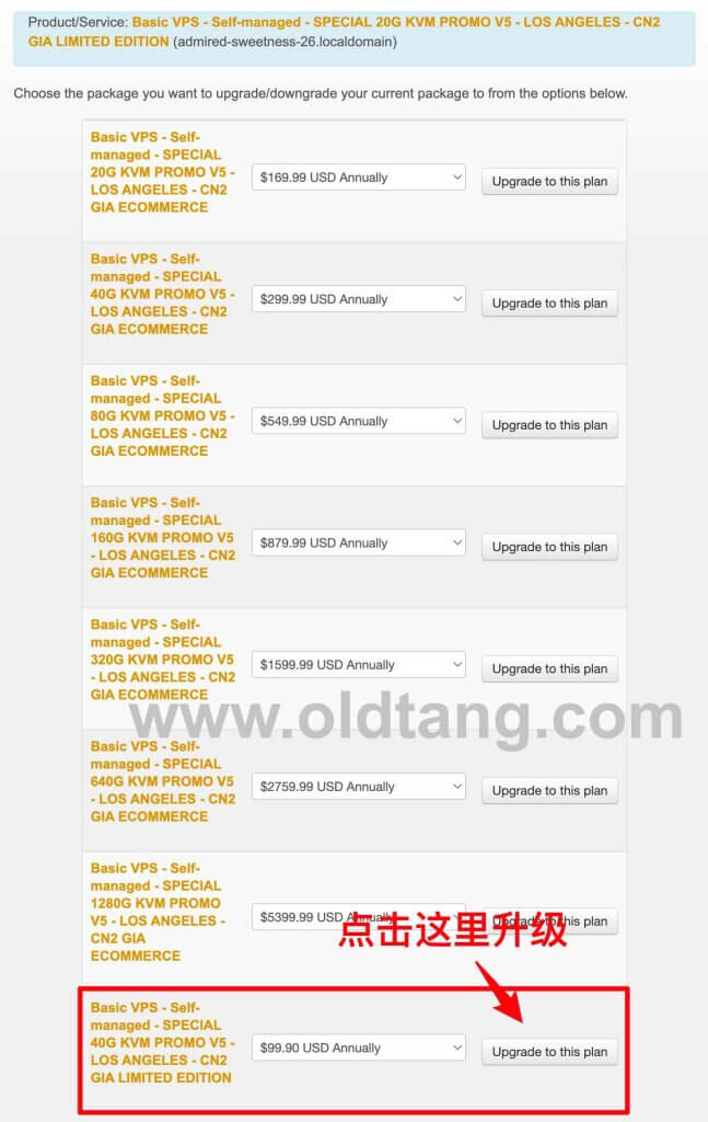 在搬瓦工 CN2 GIA-E 限量版套餐的升级选项里,可以看到下面的 Basic VPS – Self-managed – SPECIAL 40G KVM PROMO V5 – LOS ANGELES – CN2 GIA LIMITED EDITION 这个套餐,也就是我们这次要升级的套餐。点击对应的 Upgrade to this plan,就可以进行升级了。具体教程可以参考《搬瓦工 THE PLAN 限量版套餐升级到 THE PLAN v2 限量版教程》这篇文章。