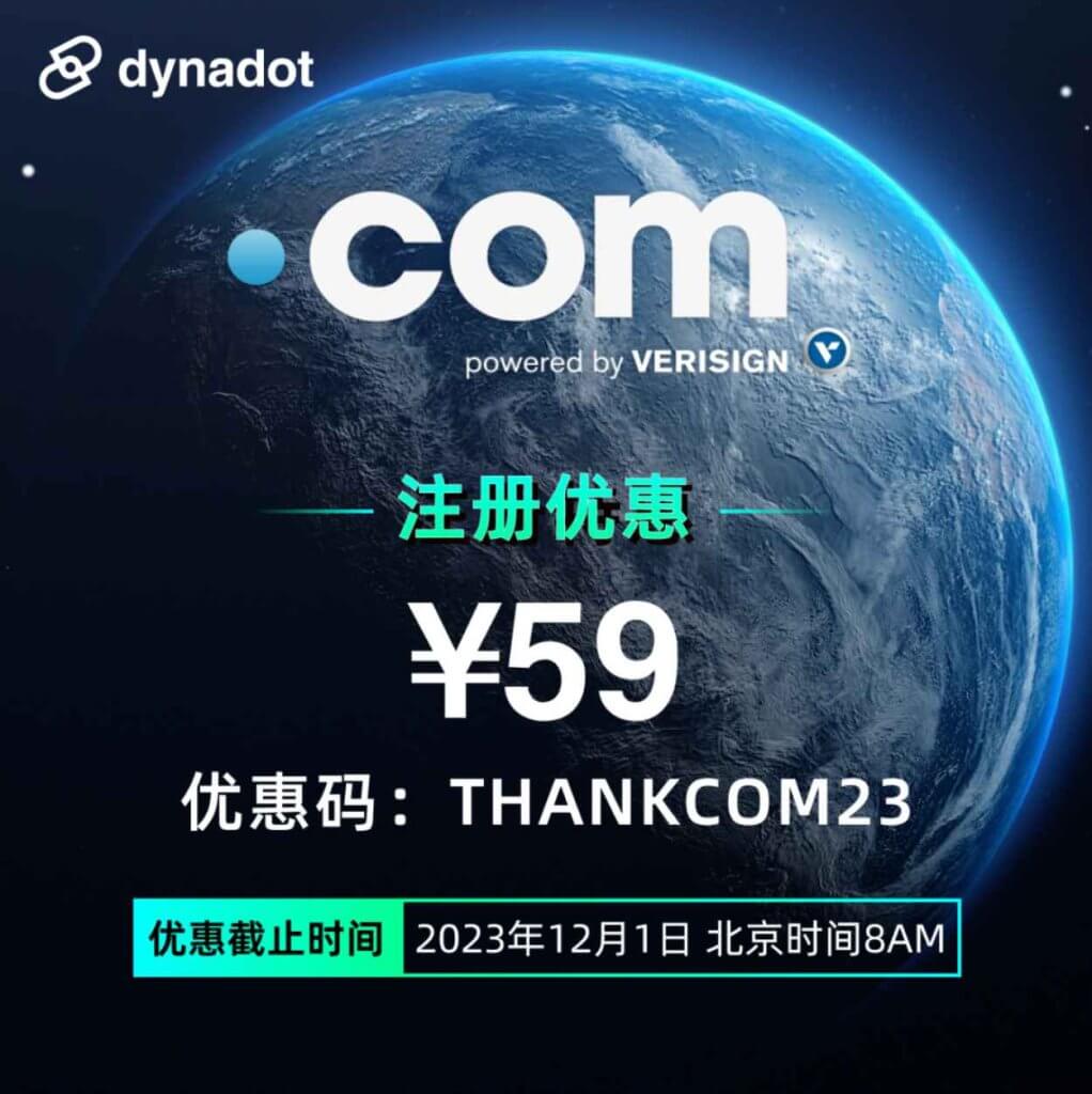 点击上面链接前往 Dynadot 官网即可参与活动,活动内容和优惠码如下。COM 域名注册优惠码是 THANKCOM23,可以复制使用。