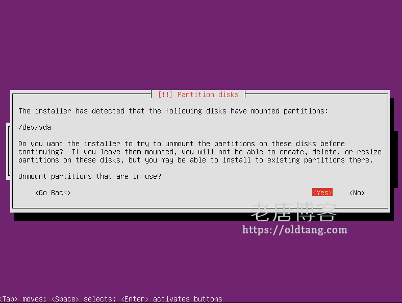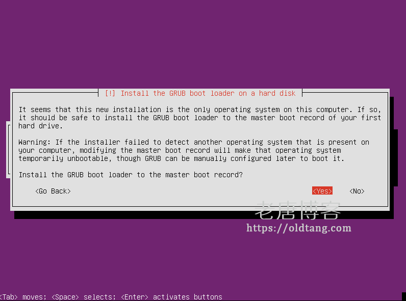 提示你是否要在整个硬盘上装 GRUB,我这里就这一个系统,所以没问题。