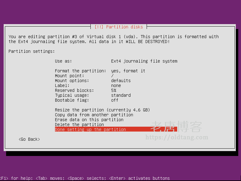 按照上面的大小进行分区,具体如下图,用作 Ext4 文件系统,然后选择是否格式化,选择挂载点。对于 /boot,把 Bootable flag 设置为 on,其他分区不需要。
