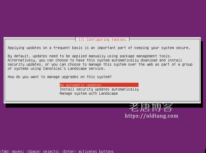 选择更新方式,我这里硬盘太小了,才 5 GB,就不自动更新了。