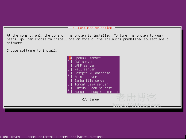 这里只需要选择 OpenSSH server,按空格进行选择,其他的都不用选。