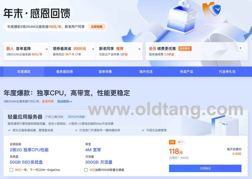 首先推荐一下年度爆款,年付价格 118 元,相当于是日常价格的二折,新老用户同享,每个月 300GB 月流量,4M 带宽,独享 CPU,非常给力。