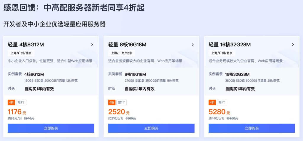 同样是新老同享,中高配置服务器可以享受四折优惠。可选地区包括上海、广州、北京等地。