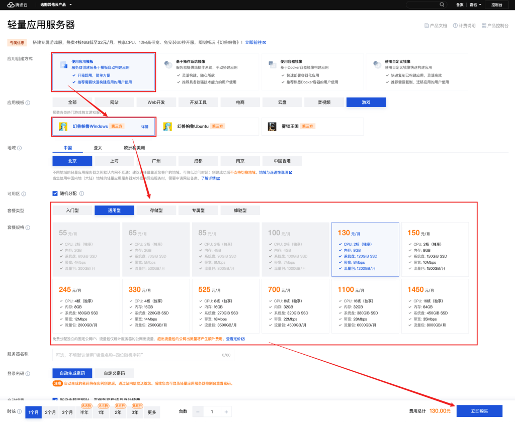 游戏服务器专属活动选购、轻量应用服务器产品常规购买页选购示意分别如下: