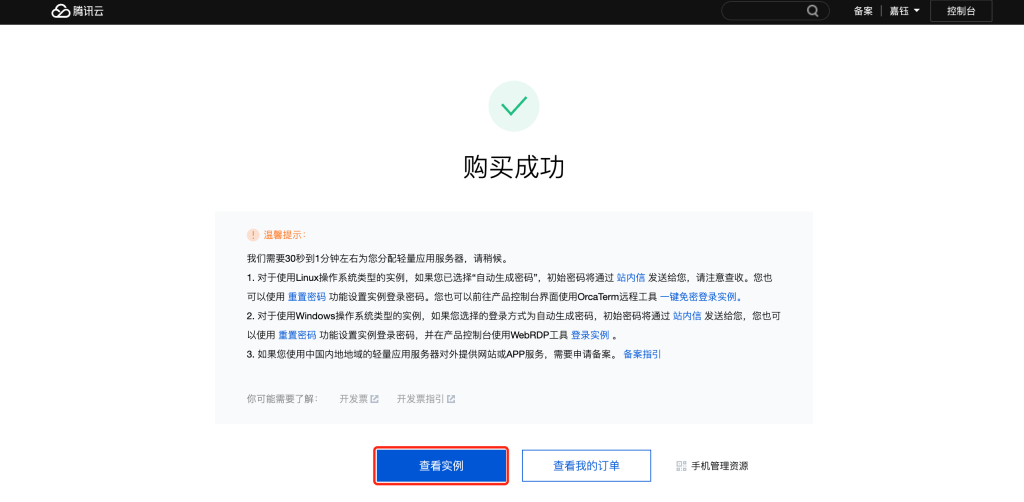 2、确认订单并成功支付后,可以在购买成功页单击【查看实例】查看您购买的幻兽帕鲁服务器。