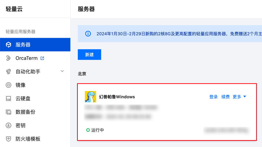 1、登录轻量云控制台,找到你想要设置虚拟内存的幻兽帕鲁 Windows 服务器,并点击服务器卡片进入详情页,找到“应用管理”。