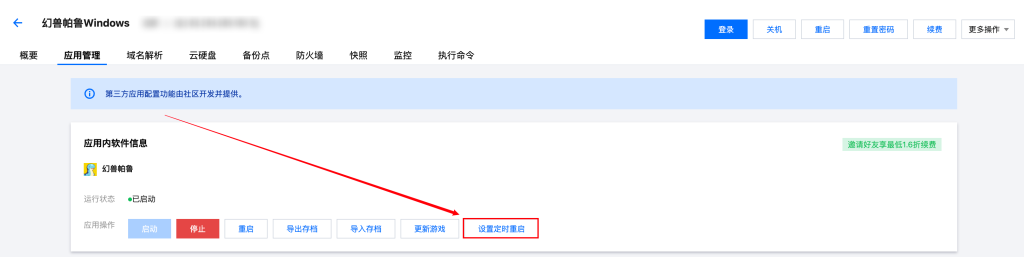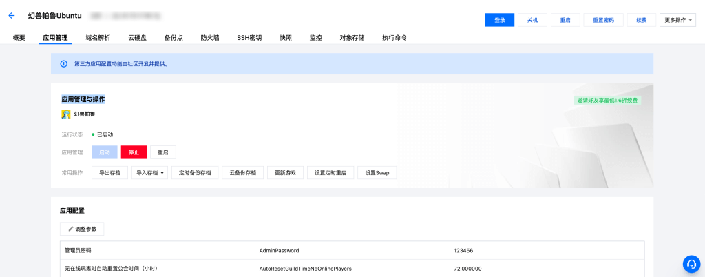 步骤二:在实例详情页点击“应用管理”,即可看到幻兽帕鲁的配置面板。